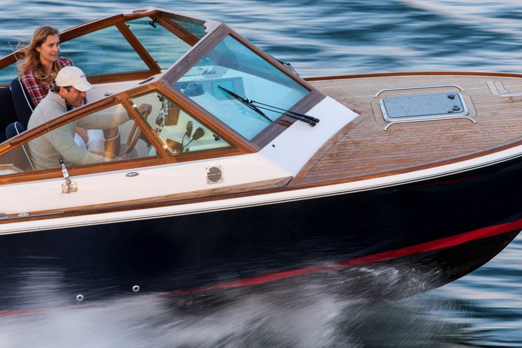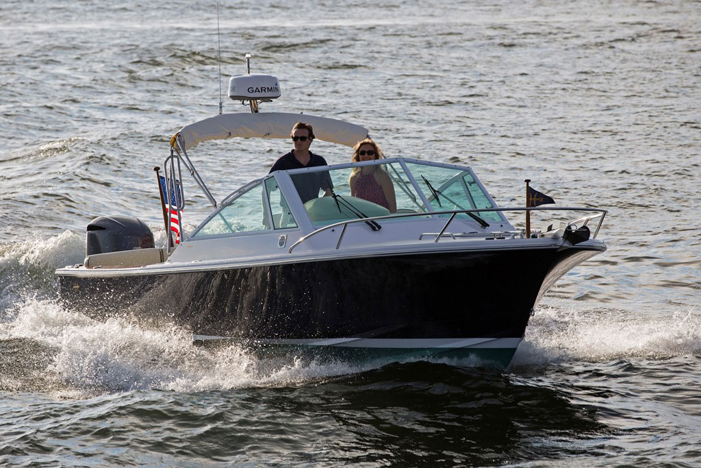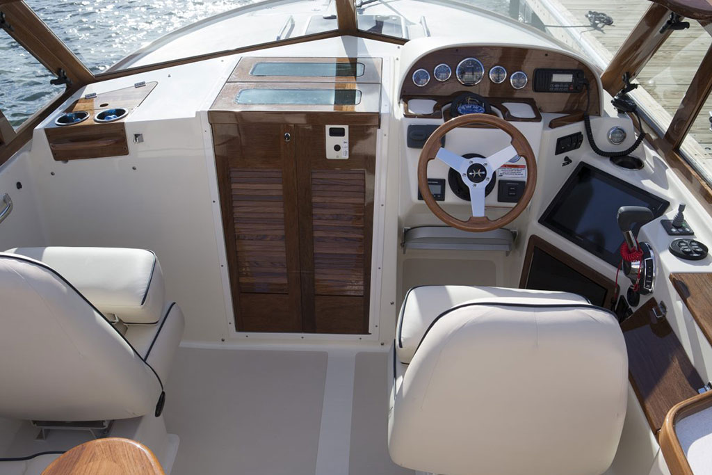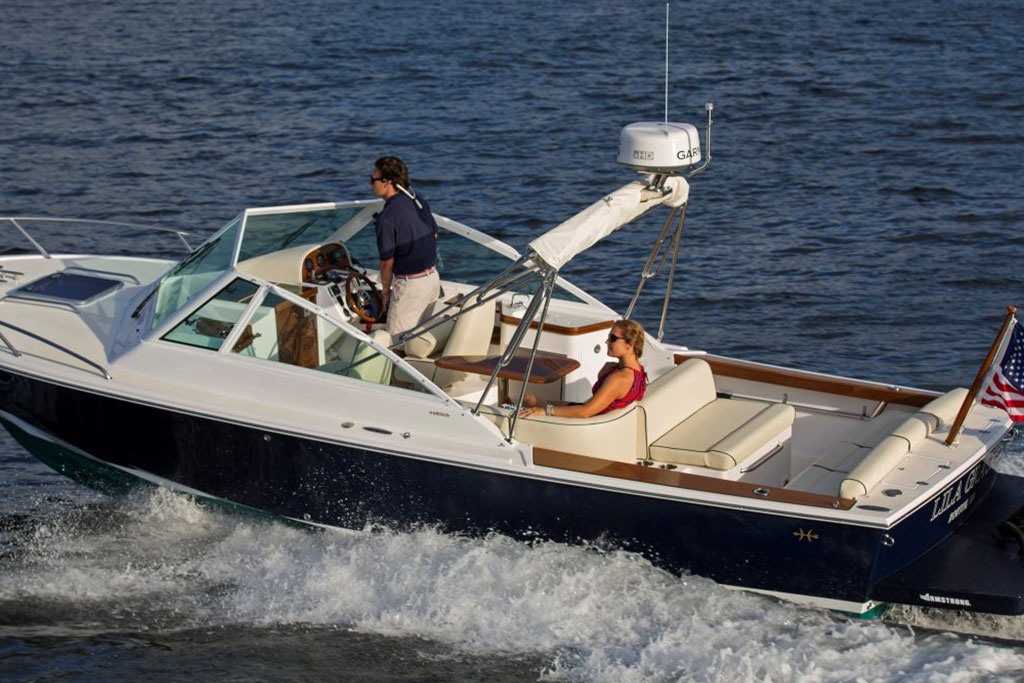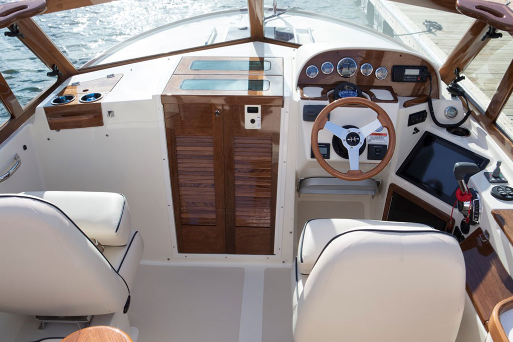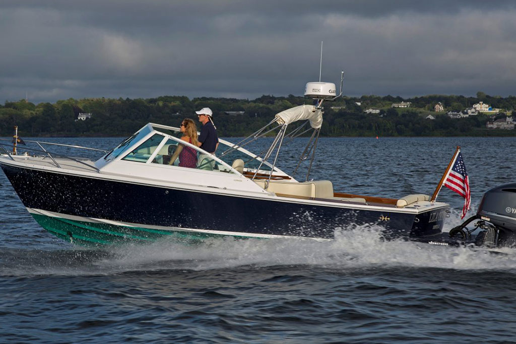 Inspired by classic yacht design, the Hunt Harrier 26 combines sharp vintage looks with streamlined modern conveniences. Gorgeous teak detailing adds timeless appeal, while contemporary comforts such as an on-deck wet bar and spacious lower bunk ensure that you and your guests enjoy every second at sea.