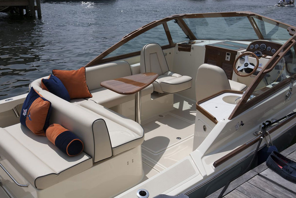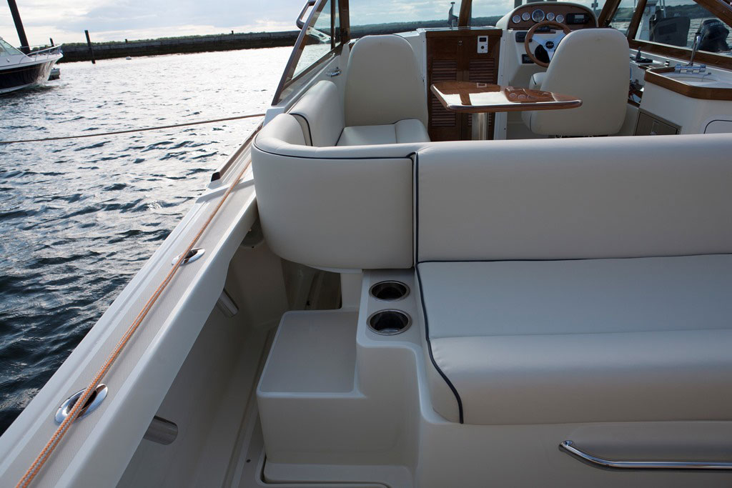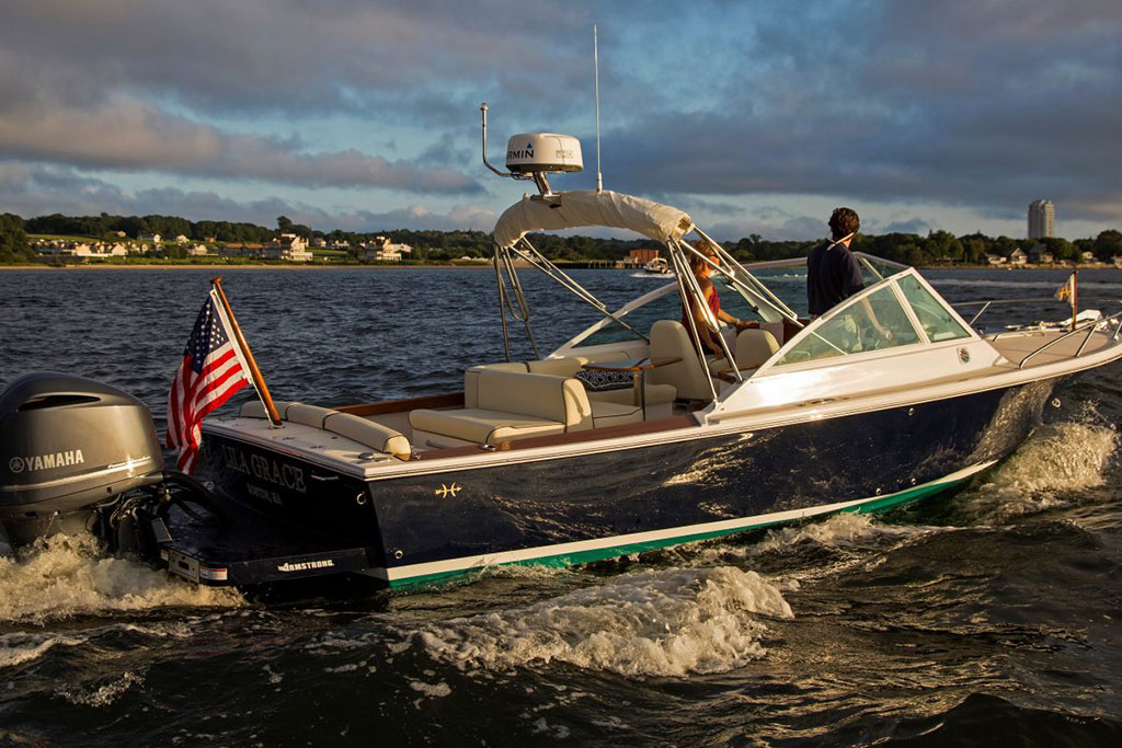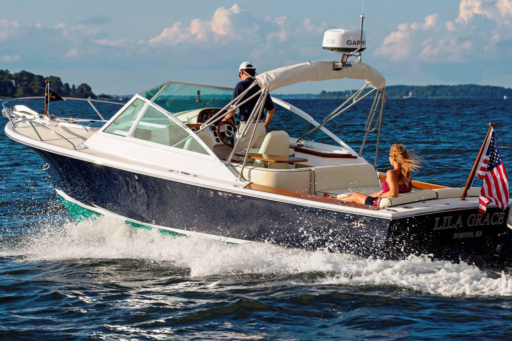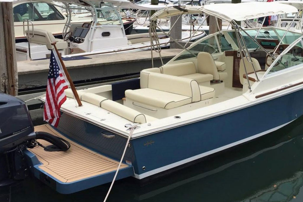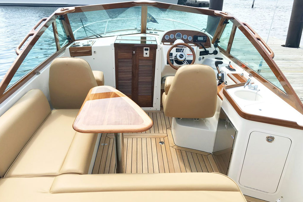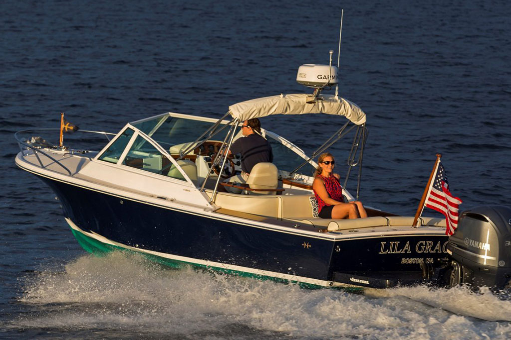 Inspired by classic yacht design, the Hunt Harrier 26 combines sharp vintage looks with streamlined modern conveniences. Gorgeous teak detailing adds timeless appeal, while contemporary comforts such as an on-deck wet bar and spacious lower bunk ensure that you and your guests enjoy every second at sea.