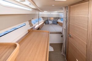 The interior layout and multifunctional seating arrangements are specially designed for social activities and entertaining. The multiple large social areas are perfect for hanging out with friends or family, relaxing, taking a swim or soaking up the sun on either the fore deck or on the aft deck. The W11 also includes new features such as folding side balconies for added space and flexibility when anchored and an optional hydraulic swim platform that extends aft of the engines so you guests on board can be closer to the water.